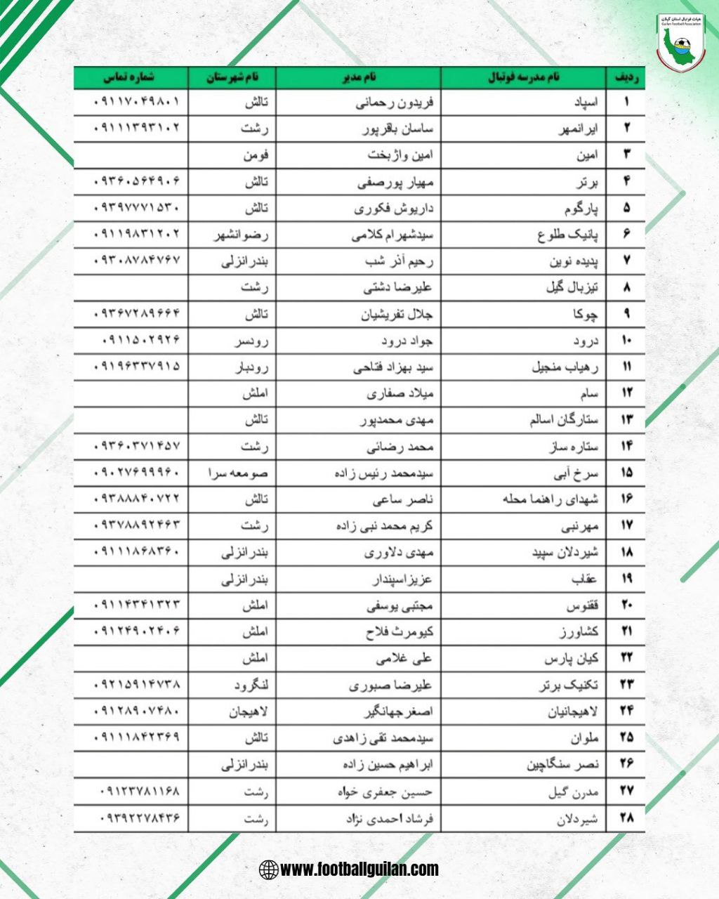 به گزارش خبر تالشی؛ هیات فوتبال استان گیلان در اقدامی پسندیده و به جا فهرست مدارس فوتبال مجاز استان گیلان فصل. ۱۴۰۵-۱۴۰۴ را منتشر کرد.