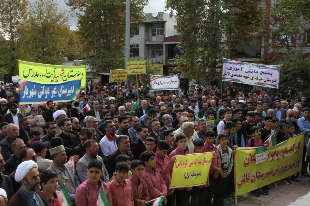 مراسم راهپیمایی ۱۳ آبان با حضور رضا جمشیدی سه ساری فرماندار تالش، امام جمعه شهرستان، اعضای شورای تامین، بخشداران، شهردار و اقشار مختلف مردم در شهرستان تالش برگزار شد.